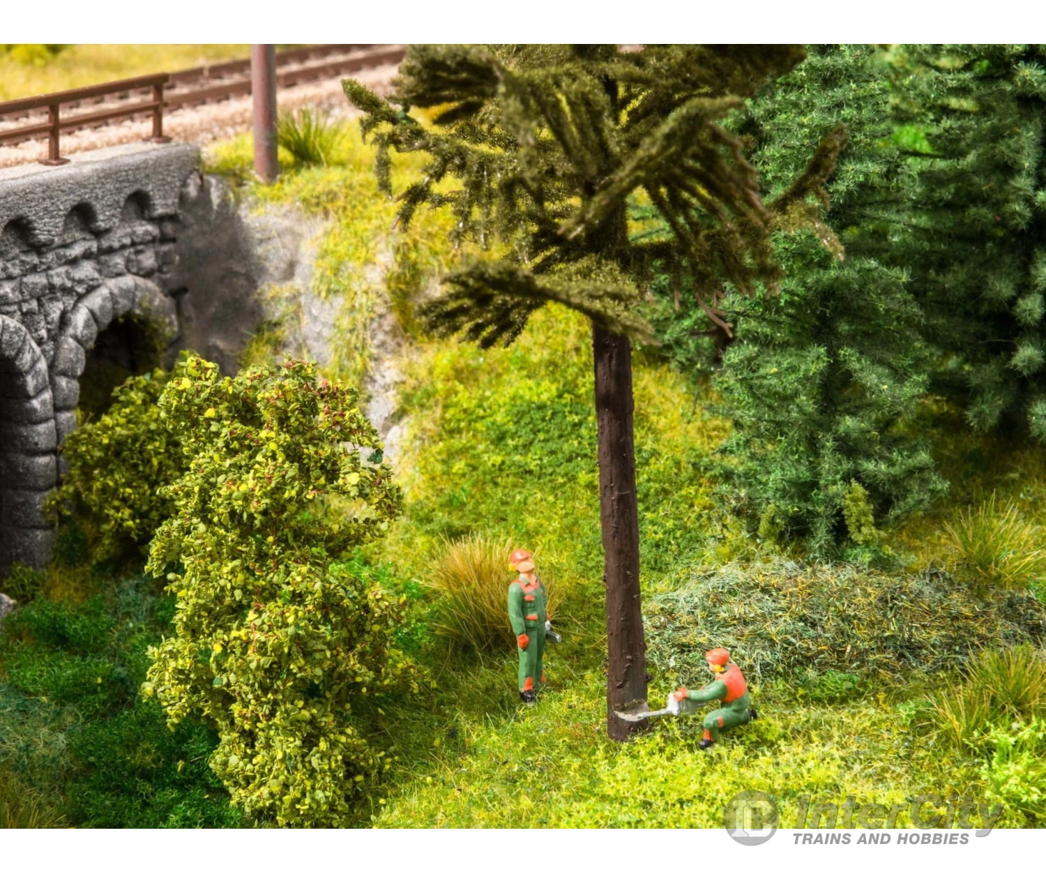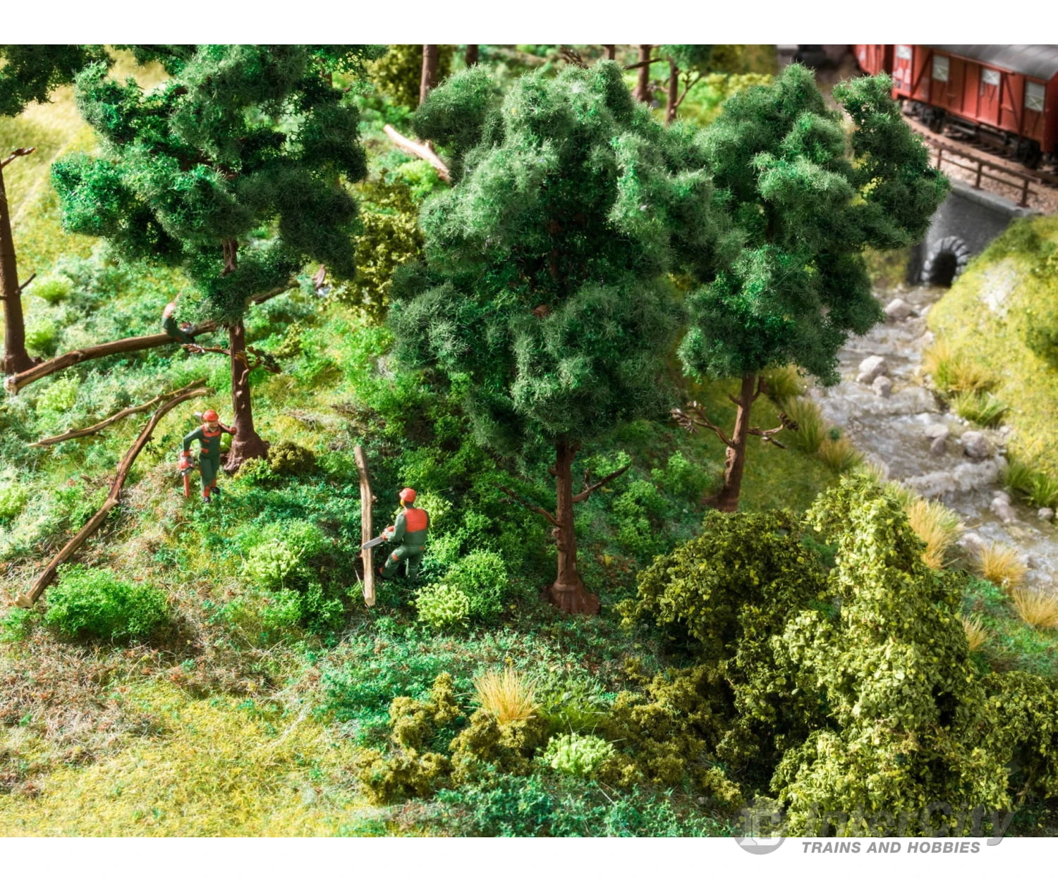 The ‘Felling Trees’ is a sound scene set that contains six lumberjacks in typical protective clothing, as well as a sound module that reproduces the realistic sounds of a chainsaw. The figures all wear orange-green clothing and carry a chainsaw with which they act out various scenes. The compact design of the electronics and loudspeaker makes it possible to place the sound directly in the model landscape so that it appears to come from the corresponding scene. The connection is made via a standard 16 V model railway transformer and is suitable for alternating and direct current. The sound lasts approx. 20 seconds.