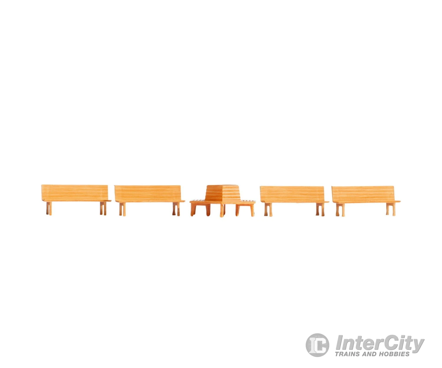 The Benches Accessoires Set contains various wooden benches, as well as a circular bench.