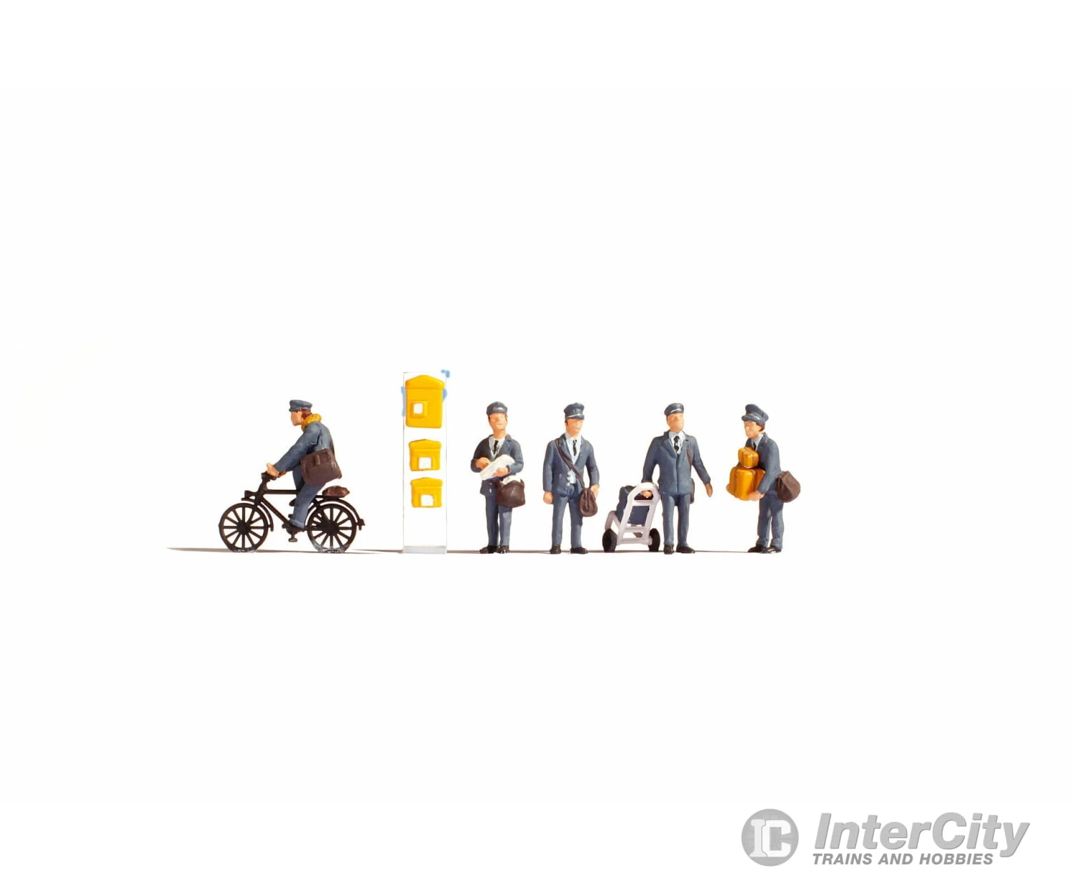 Das Set enthalt funf Modelle von deutschen Postbooten. Die Briefzusteller tragen die traditionelle blaue Uniform mit Hemd, Krawatte und Postkappi.