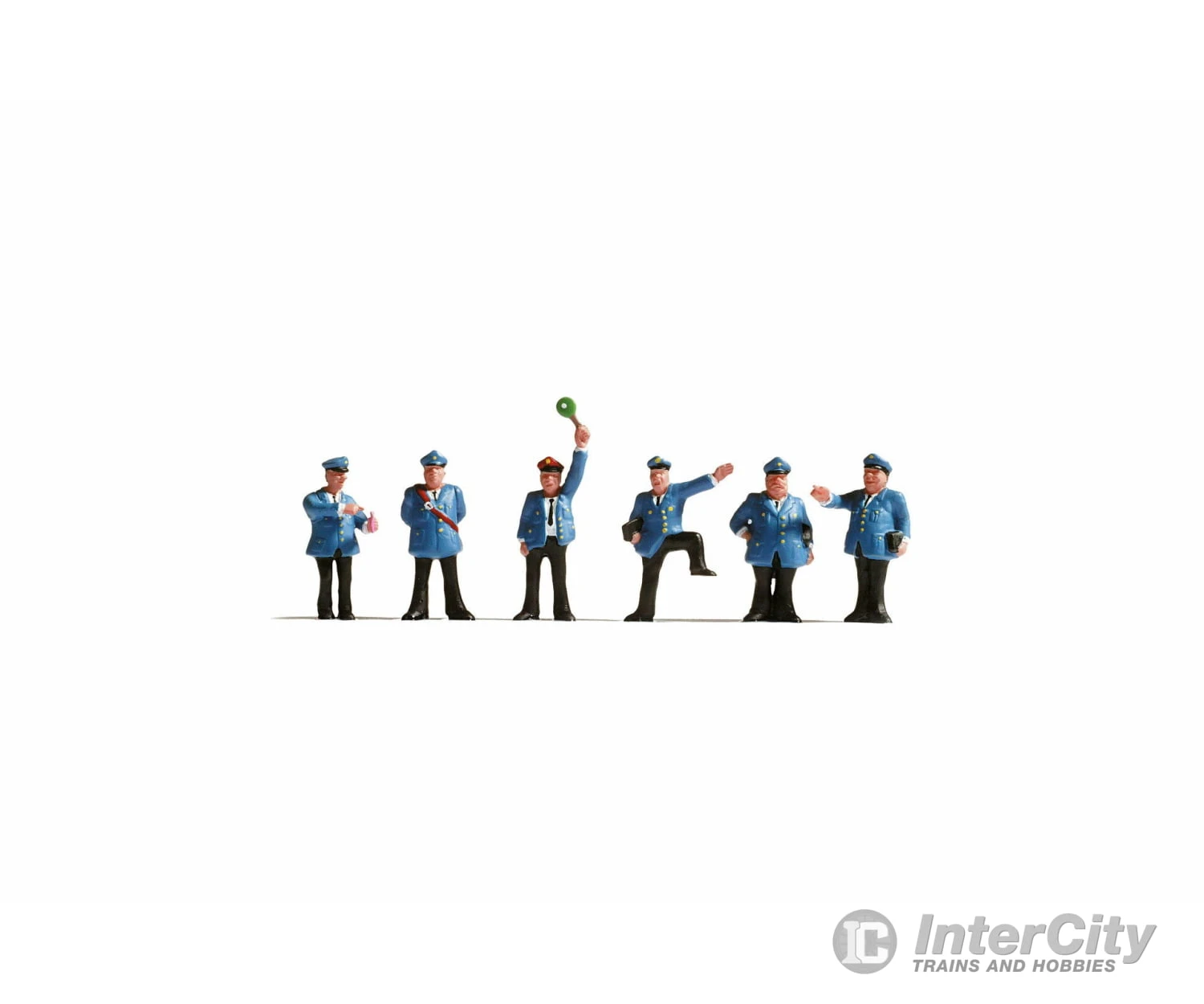 Das Bahnpersonal tragt die typische Uniform aus schwarzer Hose, blauer Dienstjacke und blauer Dienstkappe. Die handbemalten Kunststoffmodelle stellen mannliche Bahnbeamte dar. Die Modellfiguren befinden sich in typischen Arbeitsposen: Ein Bahnbeamter hebt die Kelle, ein zweiter erteilt einem Reisenden eine Auskunft, ein weiterer greift an die Zugture. Das Bahnpersonal ist ideal um Bahnhofsszenen und Bahnsteige auf Modellbahnanlagen zu dekorieren.
