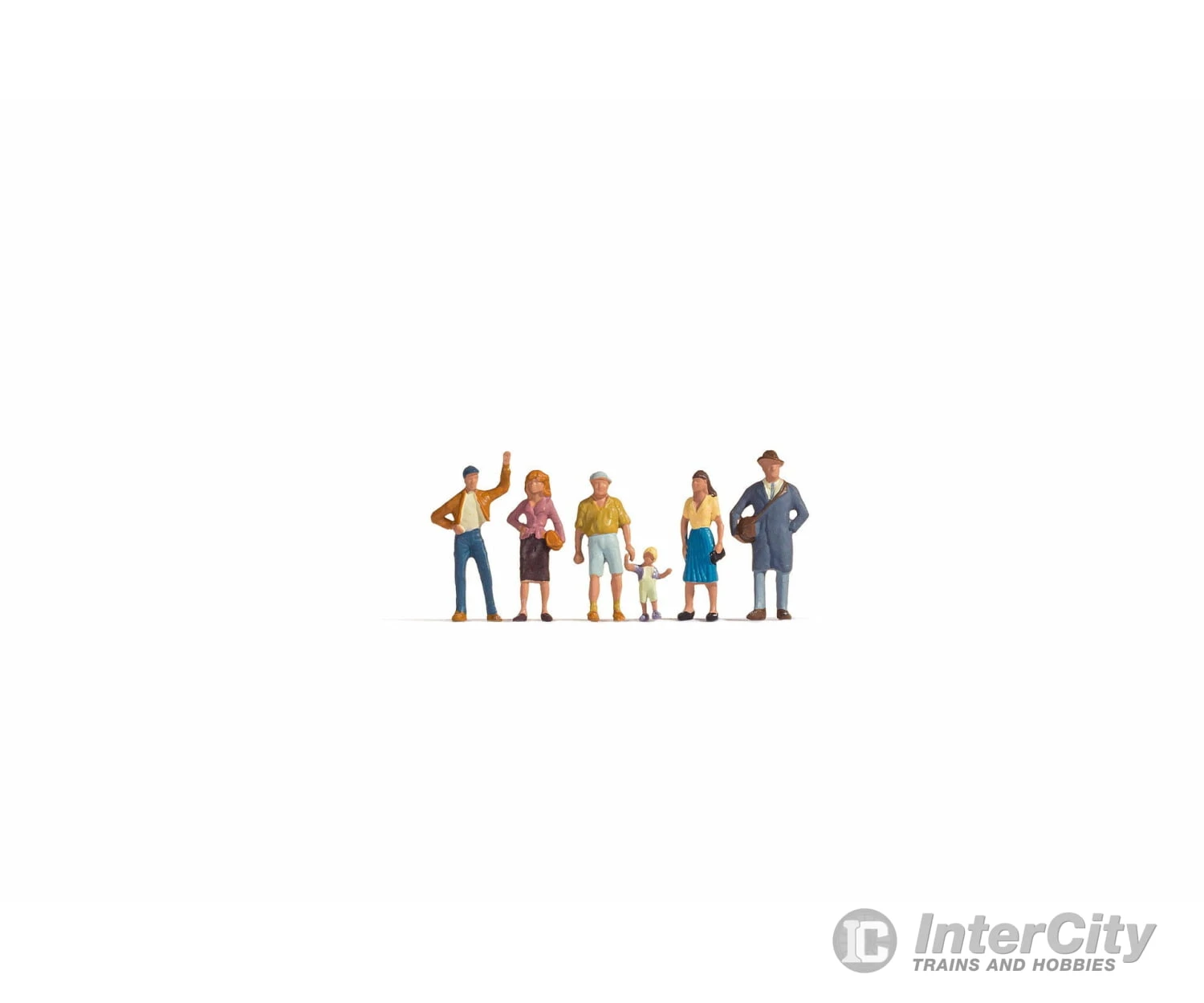 A young man wearing jeans and a leather jacket is waving; a business woman in business fit, carrying a bag under her arm looks ahead. A grandfather in short pants and short-sleeved shirt holds his grandchild by the hand. A young woman in a blue pleated skirt and yellow blouse stands looking on. A tall man in a gray trench coat and hat stands waiting. This set is ideal for decorating town or village scenes on model railroad layouts. The model figures are especially suitable for the design of platforms and bus stops