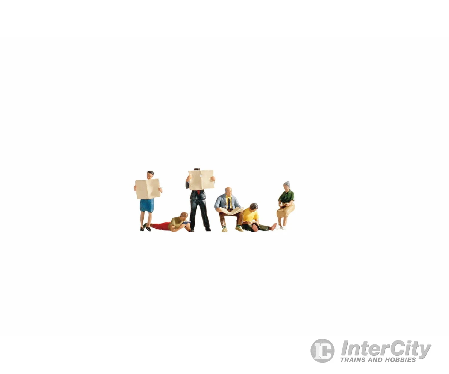 A man with red pants and a light brown shirt is lying on the ground and reading a book he holds in his hands. Another seated man with a grey jacket, brown pants, yellow shirt and black tie is reading the newspaper. The younger woman with a blue skirt and the man with a grey suit and black hat are also reading the newspaper. In addition, the set includes two more seated figures, both holding a book in their hands. The boy wears a yellow t-shirt and green pants, while the older, grey-haired lady wears a beige skirt and a green shirt.