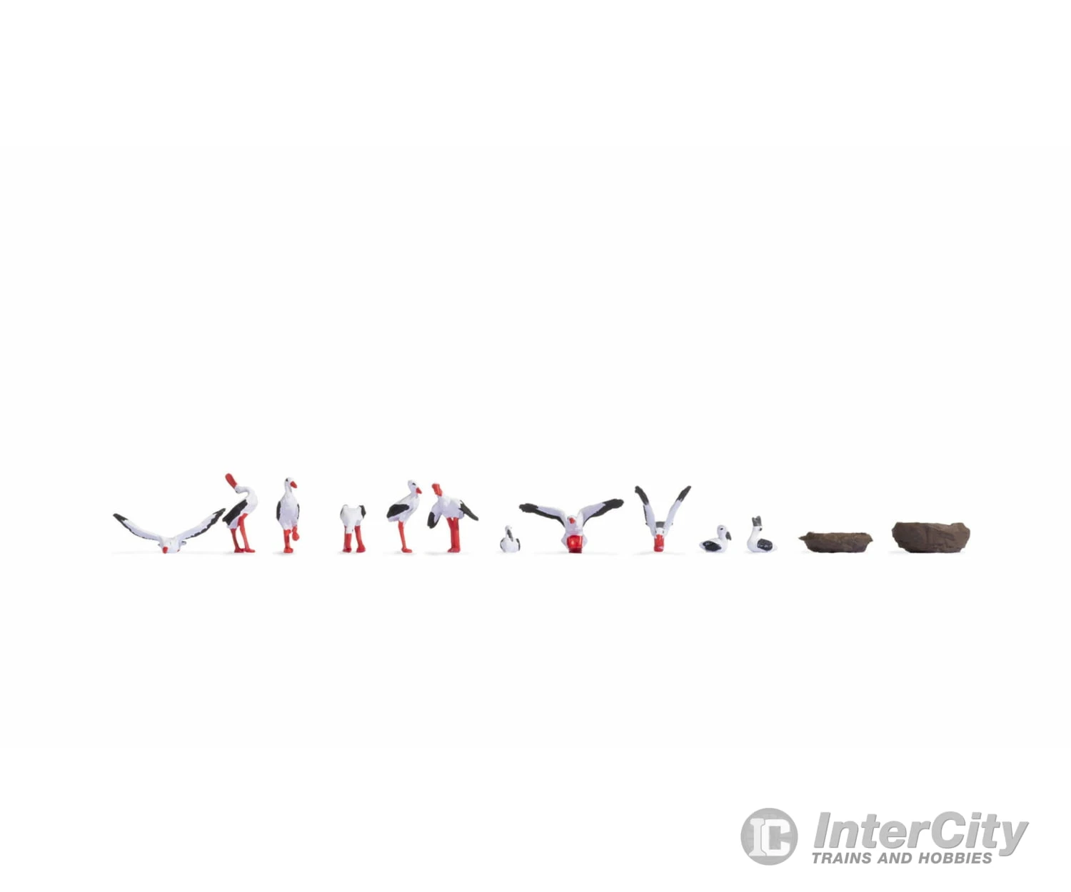 Storks often build their nests on the roofs of churches, railway stations or other buildings. With the Figures Set “Storks” for H0 gauge, you can recreate this scene in a model. Eleven storks and two nests are included in the set. One of the storks is about to take off while another lands on the ground. Six storks are standing on the ground, one of which is stretching his beak towards the ground for food. Another stork is flying while two baby storks sit in the nest. The open beak of one of them is pointing upwards waiting for food that his mother is bringing.