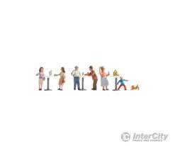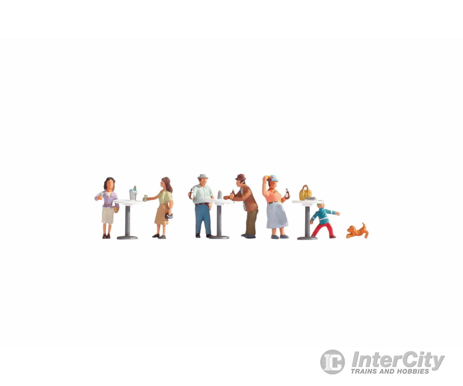 The set for the H0 gauge (scale 1:87, approx. 2cm high) contains five adults, a child, a dog and 3 standing tables with food.