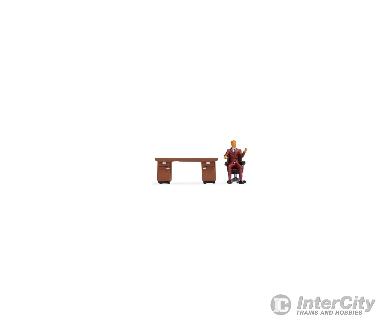 With the Tiny Scenes, you can create an everyday scene such as office work in the model. This scene includes a male employee in a dark brown suit, white shirt and tie. He sits on a swivel chair and gestures with his hands. There is also a brown desk with silver handles on the drawers and doors. The small set is ideal for recreating an everyday office scene and is suitable for the interior design of rooms and buildings in a city scene.