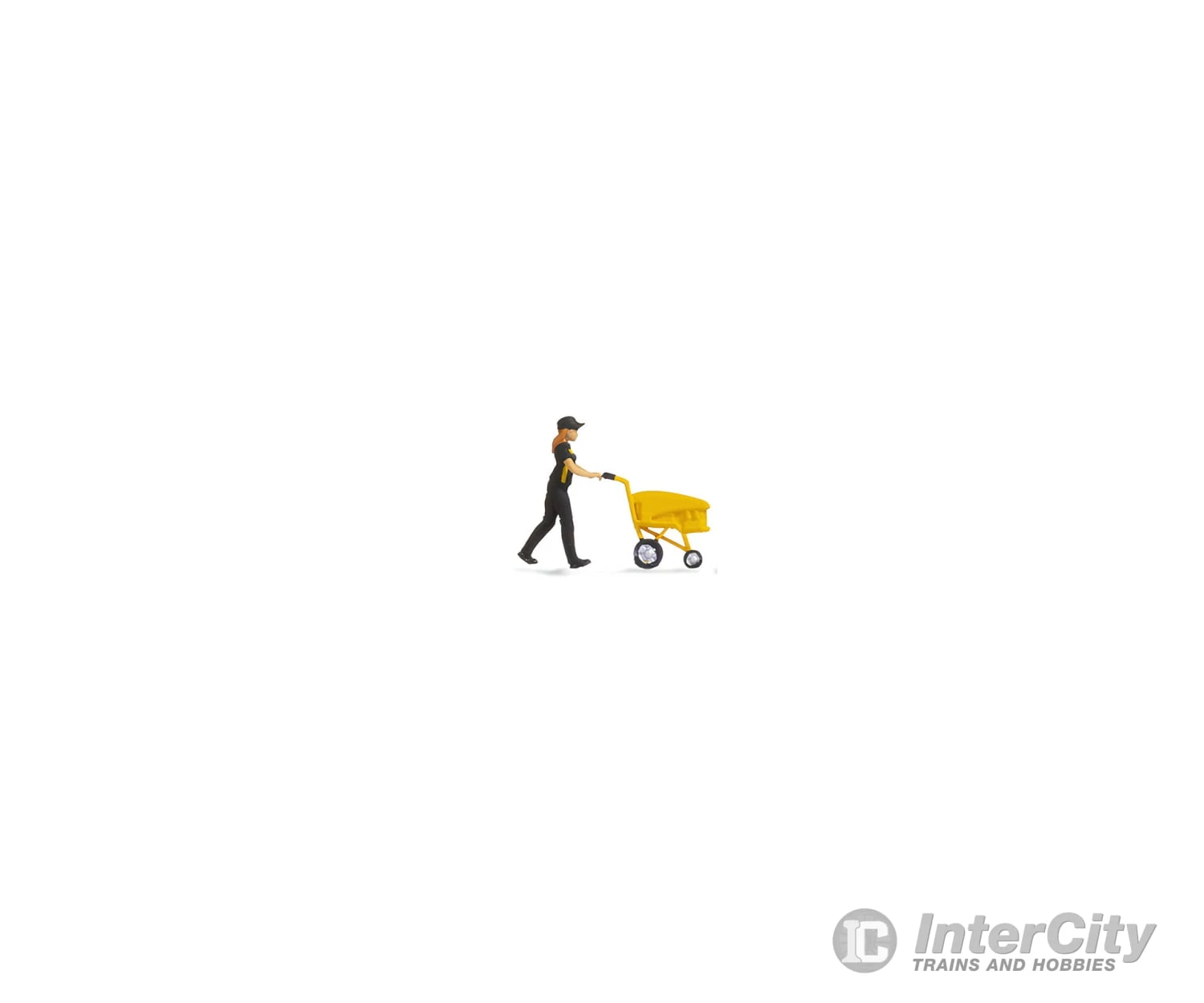 With the Tiny Scenes, you can create a realistic scene such as everyday working life like construction work on buildings or roads in the model. This scene includes a female postwoman with a typical black and yellow top and a beater’s cap. She pushes a typical yellow post van in front of her in which there are letters for distribution.
