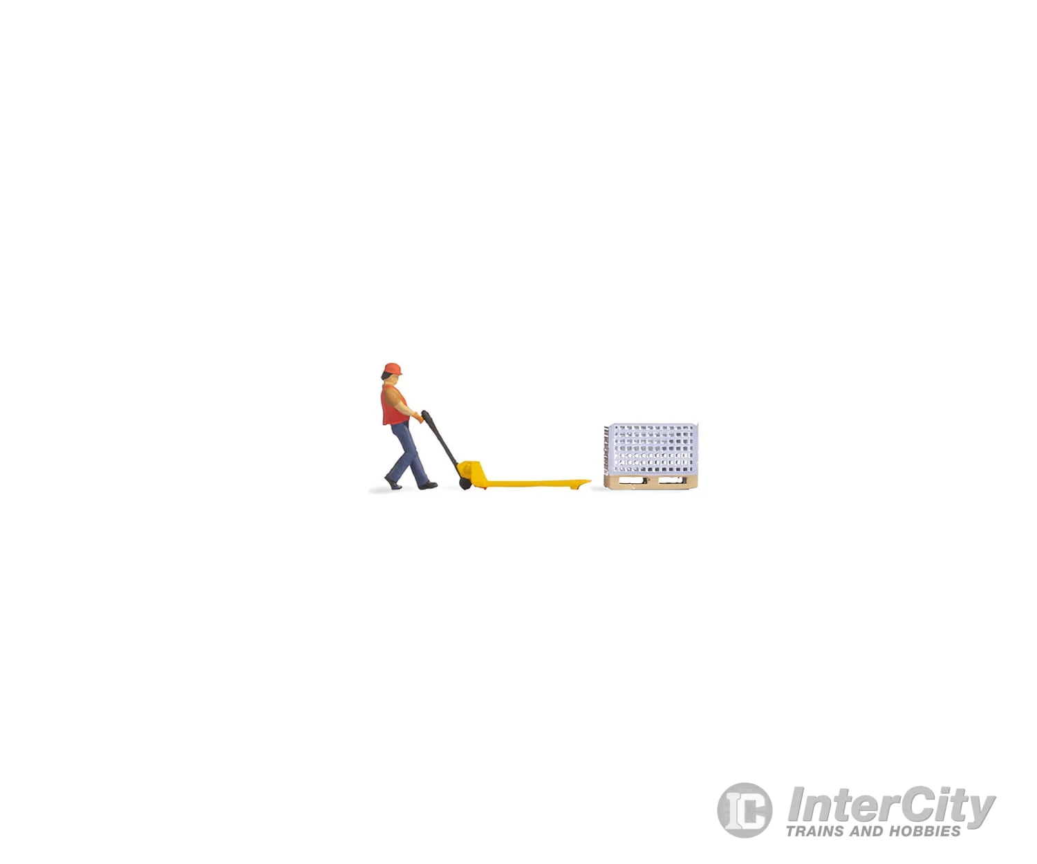 With the Tiny Scenes, you can create a realistic scene in the model, such as everyday working life like construction work on buildings or on roads. In this scene, a male warehouse worker is driving a pallet truck. He is wearing an orange waistcoat, an orange cap and dark blue work trousers. The set also includes a matching Euro pallet with metal mesh box.