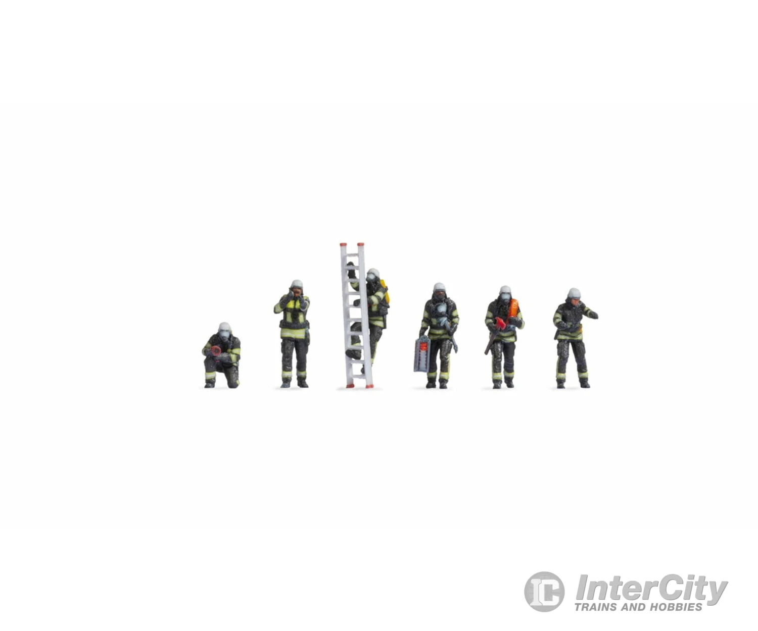 The “Fire Brigade” set contains firefighters wearing fire-resistant protective clothing. This comprises a black, knee-length jacket, black trousers, black safety shoes and black gloves. And there is a white hard hat on their heads. Fluorescent yellow strips are attached all over their clothing so that the firefighters cannot be overlooked in the dark and can continue their work without interruption.