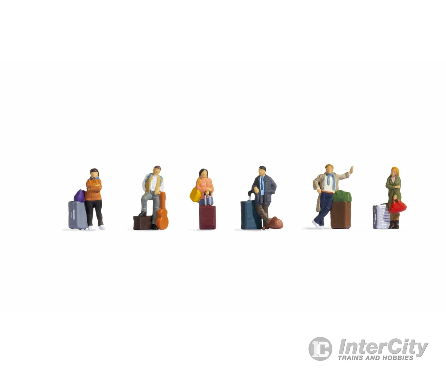 With the Figures Set “Passengers” for N gauge, you can design detailed railway station scenes. The set contains six figures and various items of luggage. While a woman with a fringe stands next to her suitcase, on which she has put her handbag, the man with a guitar rests a foot on his suitcase. There are also two women with handbags standing next to their suitcases. There are also two men in the set who are leaning on their suitcases and also have hand luggage with them. One of them is wearing a scarf around his neck and has his hand stretched out to hail an approaching taxi.