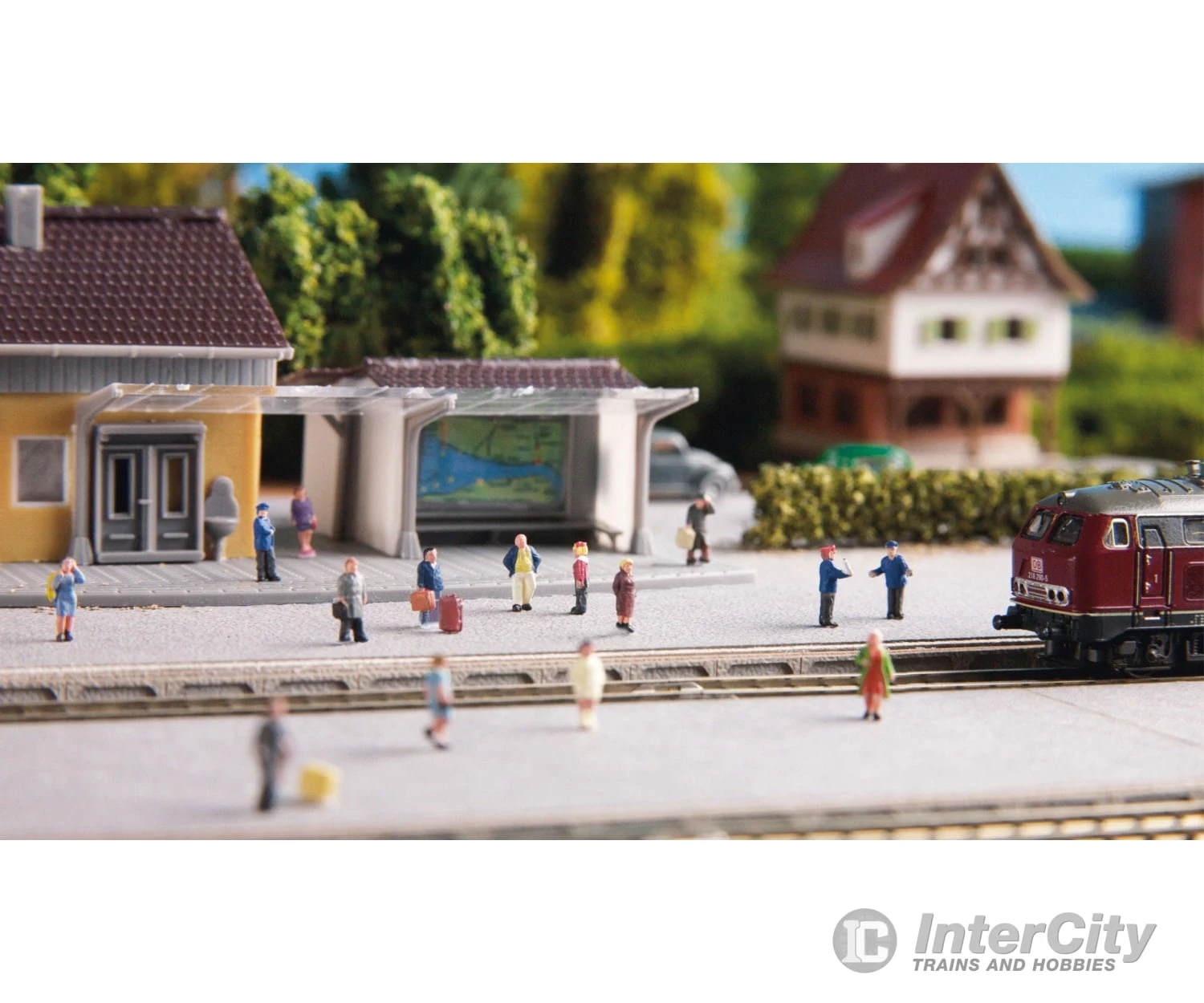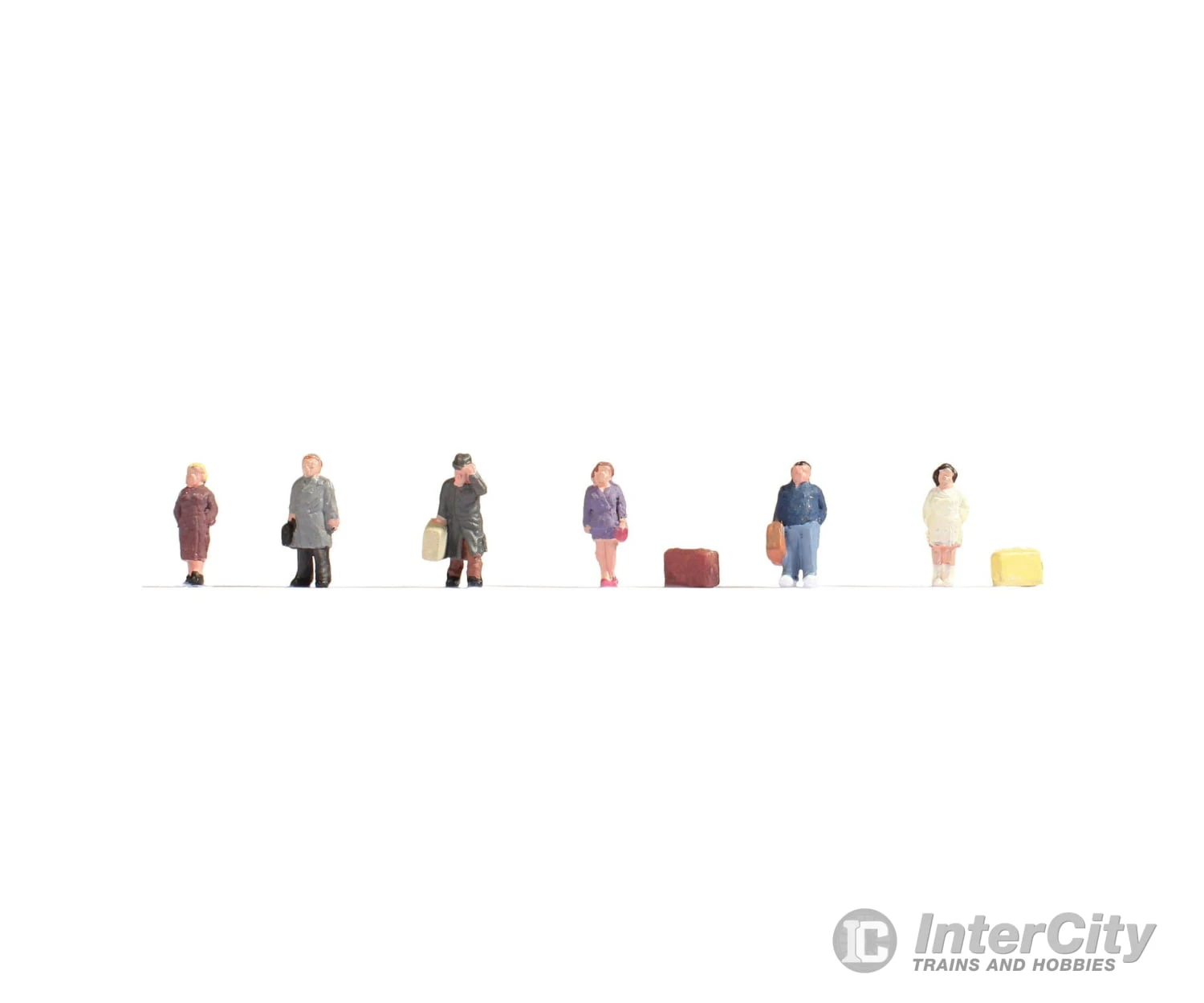 The set of model figures contains six »Travellers «. All of the figures are hand-painted and ideal for the creation and decoration of model train station and platforms. Three of the figures are male and three are female. All of them come with a suitcase or a briefcase, since they are either on their way to work or are going on a holiday trip. Their clothing is also diverse in colour. Everything is included, form a short lilac-coloured dress, or a brown coat, to a formal grey-and-black suit.