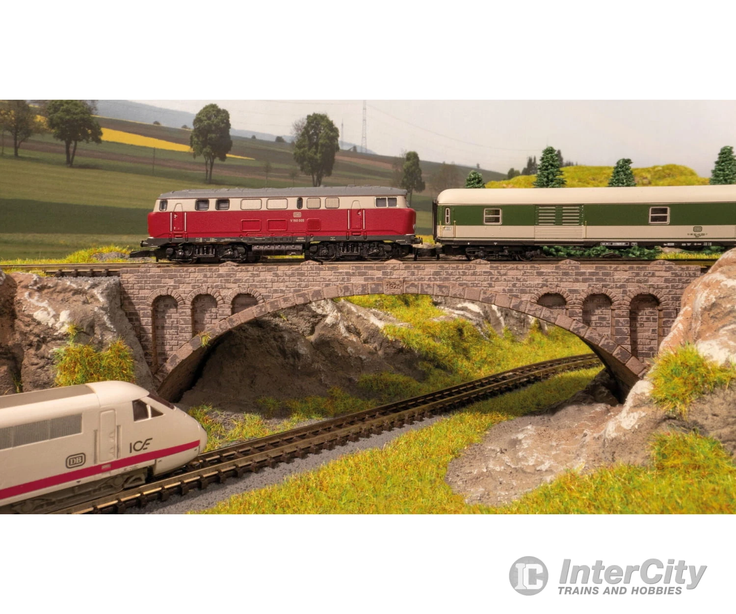 The beautiful Stone Arch Bridge’s compact design means it blends in with many setup requirements on your model railway layout. The bridge is single-track and can be used for both rail and road traffic. The width of the lane is equivalent to a narrow road, as is often found in the Alps to this day.