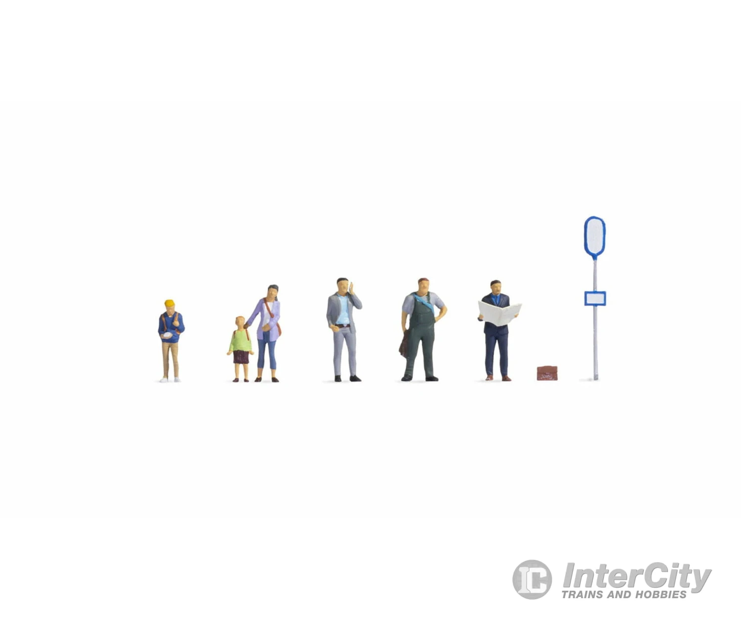 The Figures Set “At the Bus Stop” in TT gauge contains six figures as well as a piece of luggage and a bus stop sign. While waiting, the man in the coat is reading the daily newspaper, holding it spread out in his hands. He has put his briefcase down next to him. Another man is wearing dungarees and holding his jacket in his hand while resting his other hand on his hip. A man in a jacket is also included, who is holding his mobile phone to his ear. The mother with a bag is stretching out her hand to her son. He is standing next to her with a backpack on his back. In addition, he has a long-sleeved shirt and shorts on. A young man is also standing at the bus stop, looking at his mobile.