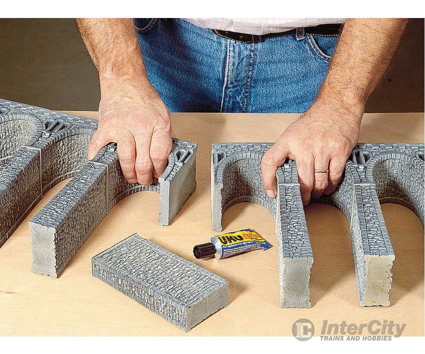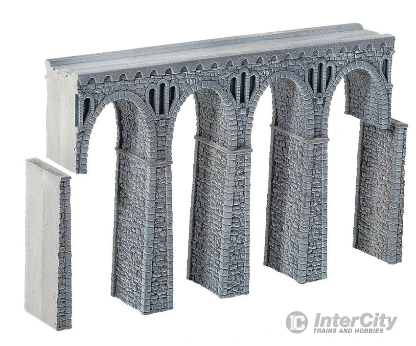The “Quarrystone Viaduct” is the eye-catcher in your model railway diorama. In order to create particularly long bridge constructions, you can combine straight and curved “quarrystone viaducts” arbitrarily. You can also combine the viaduct with the Viaduct Rhone. The kit includes the viaduct and the material necessary for constructiong a fitting bridge head.