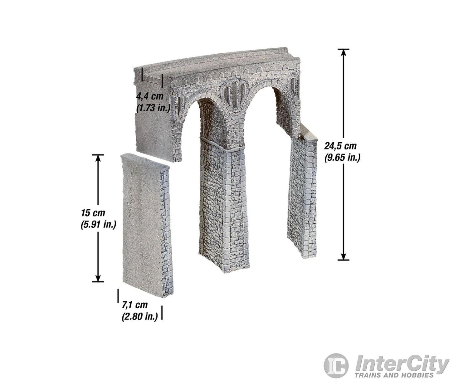 Six curved quarry stone viaducts placed together form a semicircle. Of course, the curved ‘quarrystone viaducts’ can be ideally combined with the straight ‘quarrystone viaduct’ or with the Rhone viaduct.To build particularly long and imposing bridge structures, straight and curved ‘quarrystone viaducts’ can be combined as desired.