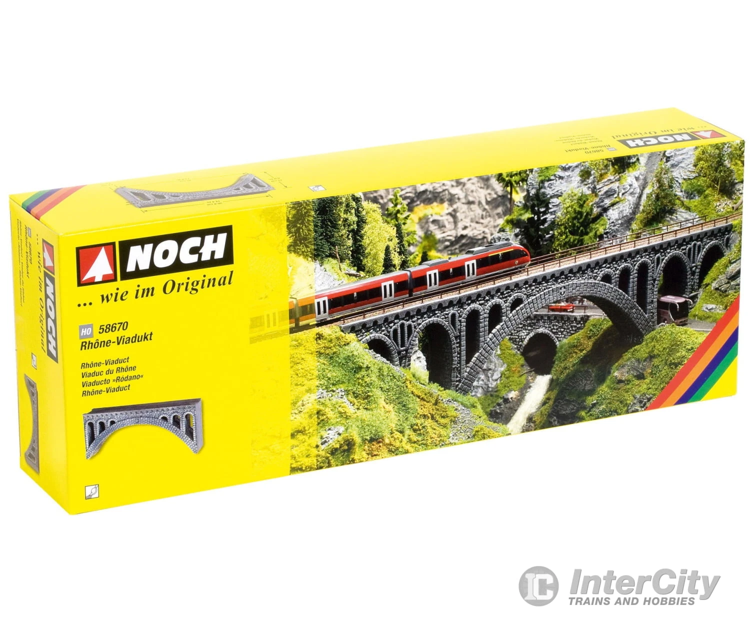 The Straight “Rhone Viaduct” is the eyecatcher on your model railway layout. The Viaducts can be combined as desired in order to construct particularly long and imposing bridge structures. Combinations with the Quarrystone Viaduct are also possible.