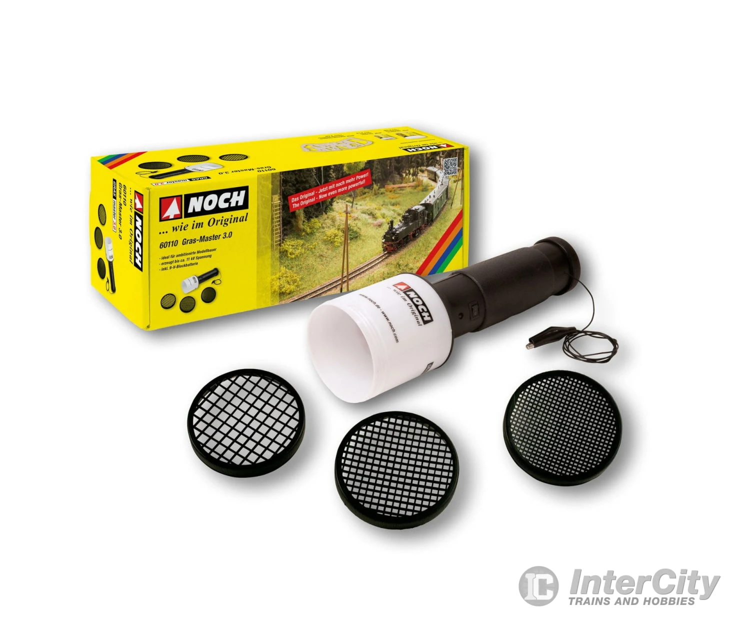 The NOCH Gras-Master 3.0 is kind of the ‘little brother’ of the PROFI variant. And like all little brothers, he has what it takes! More compact, agile and yet powerful; that’s how you could describe the Gras-Master 3.0. The centrepiece is a 9 V battery. This one was also used in the Gras-Master and Gras-Master 2.0. Due to the battery’s smaller dimensions, the device is more compact and consequently slightly lighter than the Gras-Master 3.0 PROFI. Its power output, however, is only marginally lower. So, it is ideal for every home’s model railway, diorama, landscape and any quick, spontaneous tasks. The device comes with three sieve attachments (fine, medium and coarse).