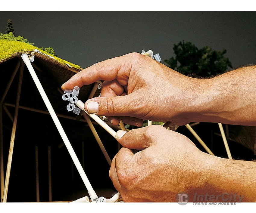 After a test drive, you start designing the landscape – over and around the track layout. The first thing you do is set up the tent-like framework. Since the round poles are only inserted into the connecting elements, the structure can be corrected and changed at any time. With this framework system, a subsequent redesign is just as easy as the ongoing ‘maintenance’ of the rails and the entire technology. When the framework is in place, it is then covered with NOCH Landscape Crepe Paper and now forms your ‘blank terrain’, which you can further develop according to your wishes.