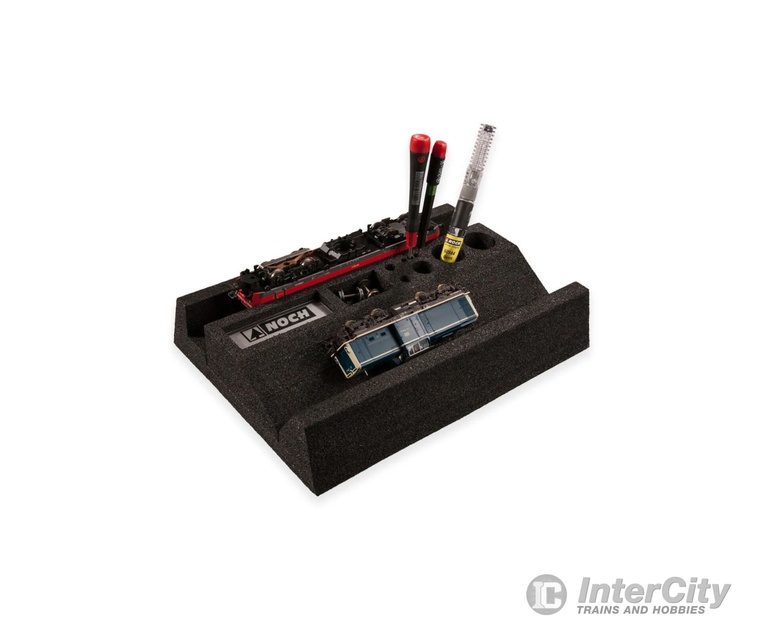 The Foam Train Service Trays have different compartments and hollows to fit a paintbrush, oiler and tools. Small parts and screws can be stored in the integrated compartments. So small parts don’t get lost, a magnetic strip is incorporated in one compartment. The tiniest screws, for example, adhere to it.